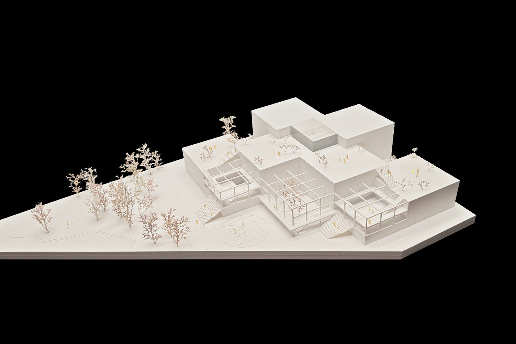Begrünte Dachterrassen staffeln sich in Richtung Garten ab und bilden eine durchgehende Dachlandschaft, die über großzügige Außentreppen – teils als Sitzstufenanlagen – in direktem Bezug zum Park stehen. So wird ein durchlässiges System geschaffen, das alle Geschosse mit dem Außenraum vernetzt und fließende Übergänge zwischen Innen und Außen sowie zwischen den Ebenen ermöglicht.