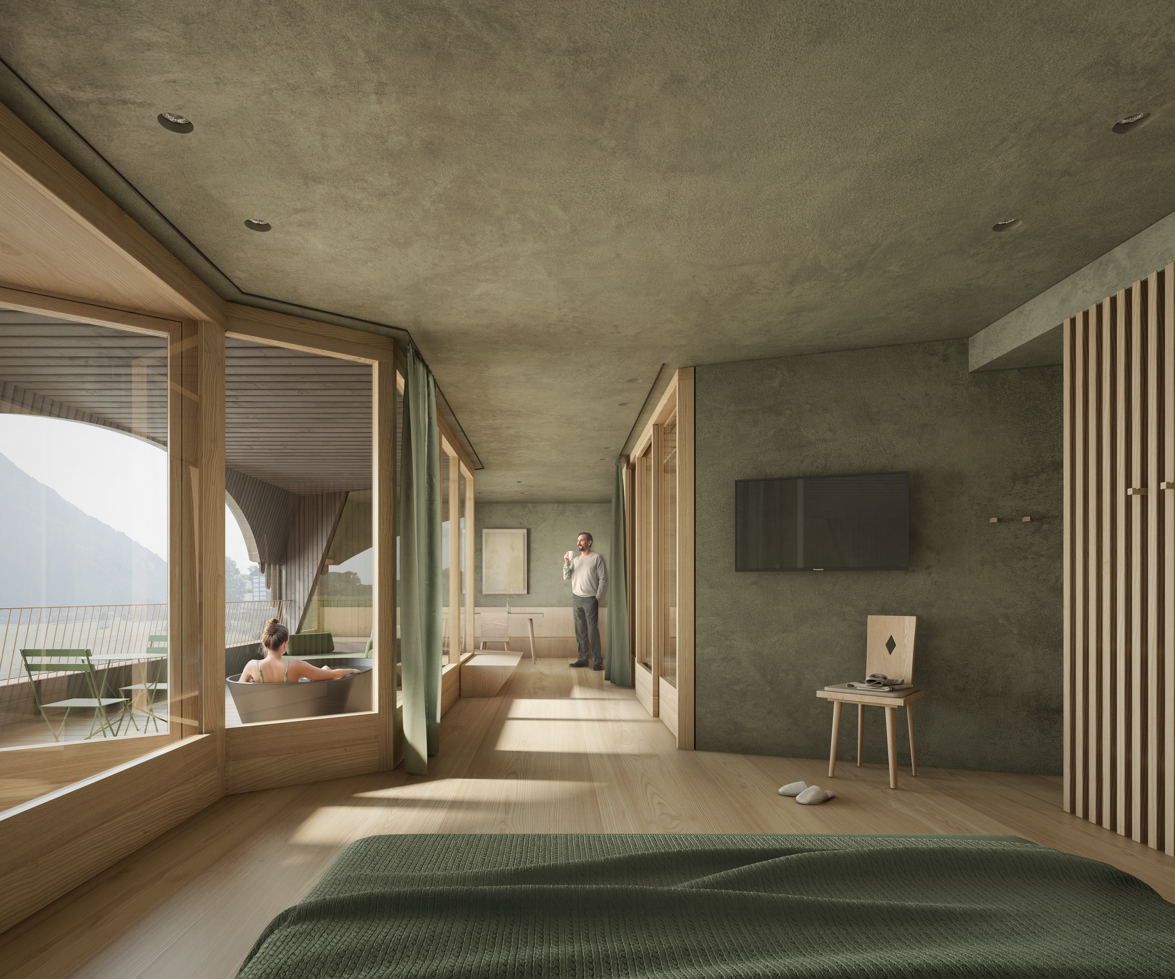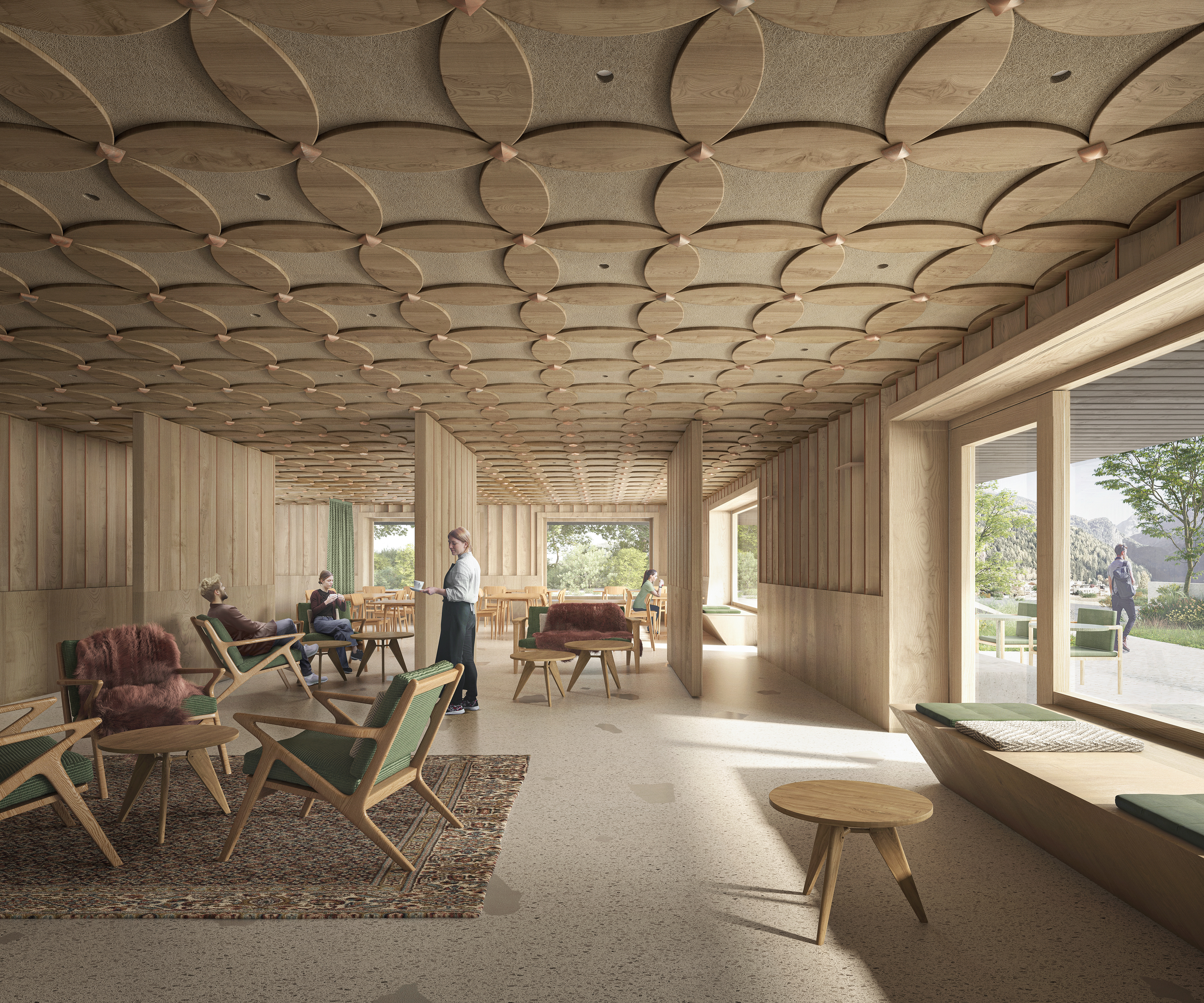 Im Inneren setzt sich diese Klarheit fort. Im Erdgeschoss entsteht ein offener Raum für Ankommen, Aufenthalt und Austausch. Küche und Restaurant sind so angelegt, dass sie flexibel genutzt werden können, für Frühstück, kleinere Veranstaltungen oder gemeinsame Momente. Große Öffnungen lassen Licht tief in den Raum fallen und verbinden ihn mit der Umgebung.