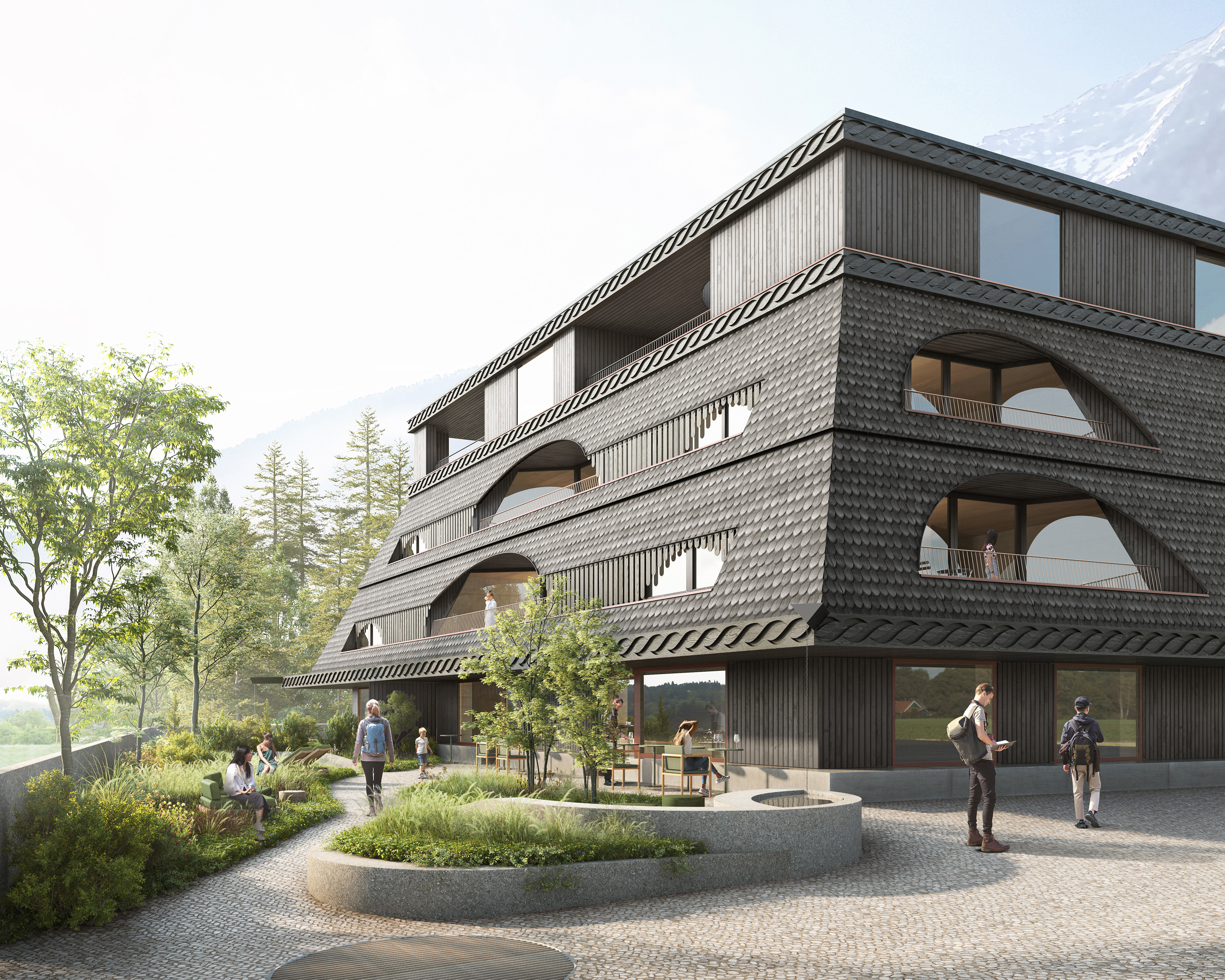 Das Gebäude ist klar gegliedert und lebt vom Spannungsfeld zwischen geschlossenen und offenen Bereichen. Während sich das Erdgeschoss öffnet, einladend und kommunikativ wirkt und den Zugang markiert, bleiben die darüberliegenden Ebenen ruhiger und kompakter. Große, halbrunde Einschnitte sind dabei prägend und formen Loggien, die als geschützte Räume zwischen Innen und Außen liegen. Sie schaffen Rückzug, ohne den Bezug zur Umgebung zu verlieren. Sie geben dem Baukörper eine eigene Identität und übersetzen das Motiv des Daches in eine zeitgenössische Form.